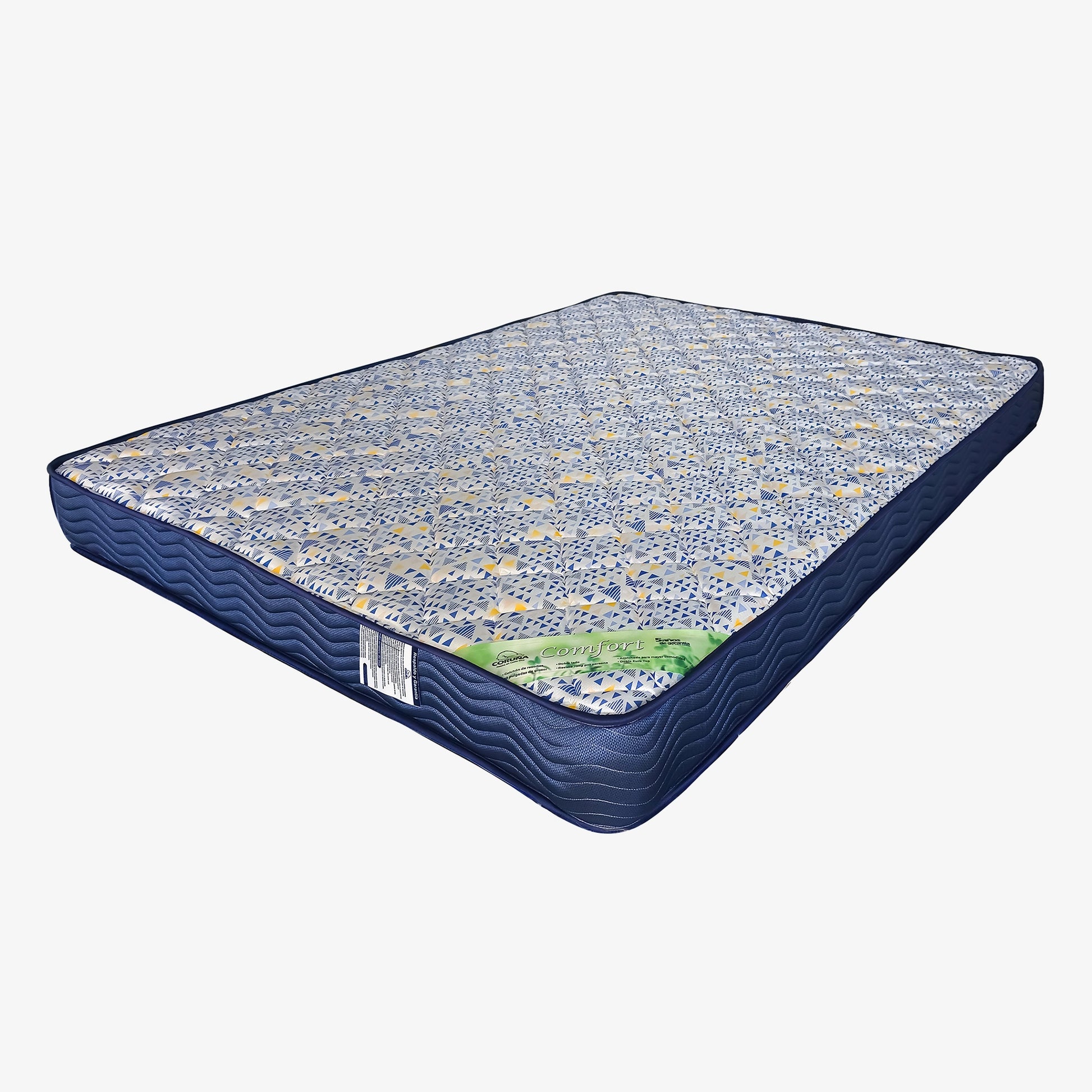 Colchón de resortes, tapizado con cubierta de poliéster, con tela multiacolchada que eleva el confort, diseño para uso por ambas caras.